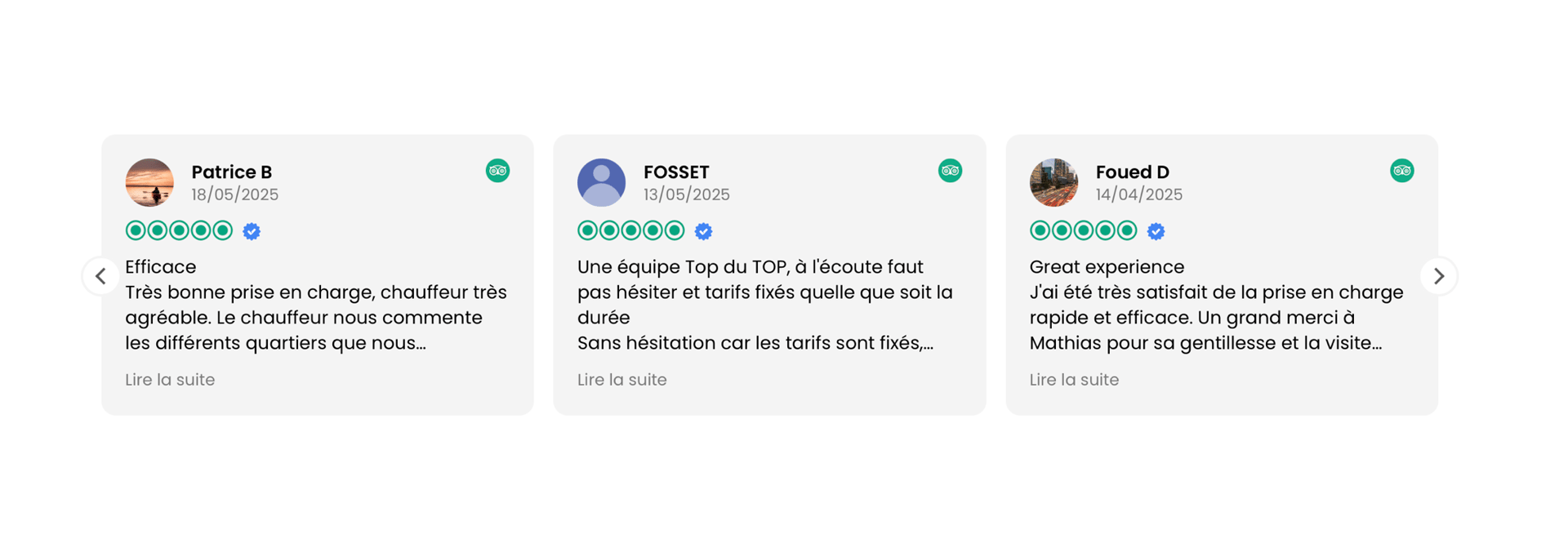 J'ai été très grave satisfait de la prise en charge rapide et efficace. Un grand merci à Mathias pour sa gentillesse et la visite touristique improvisée pendant le trajet, un vrai plus++ ! Je recommande ce service sans hésitation et compte bien refaire appel à vous "
